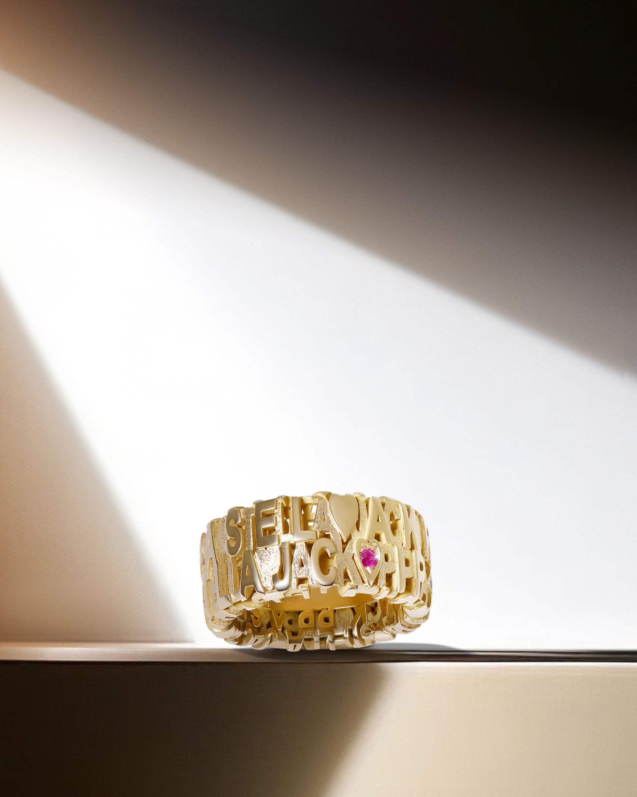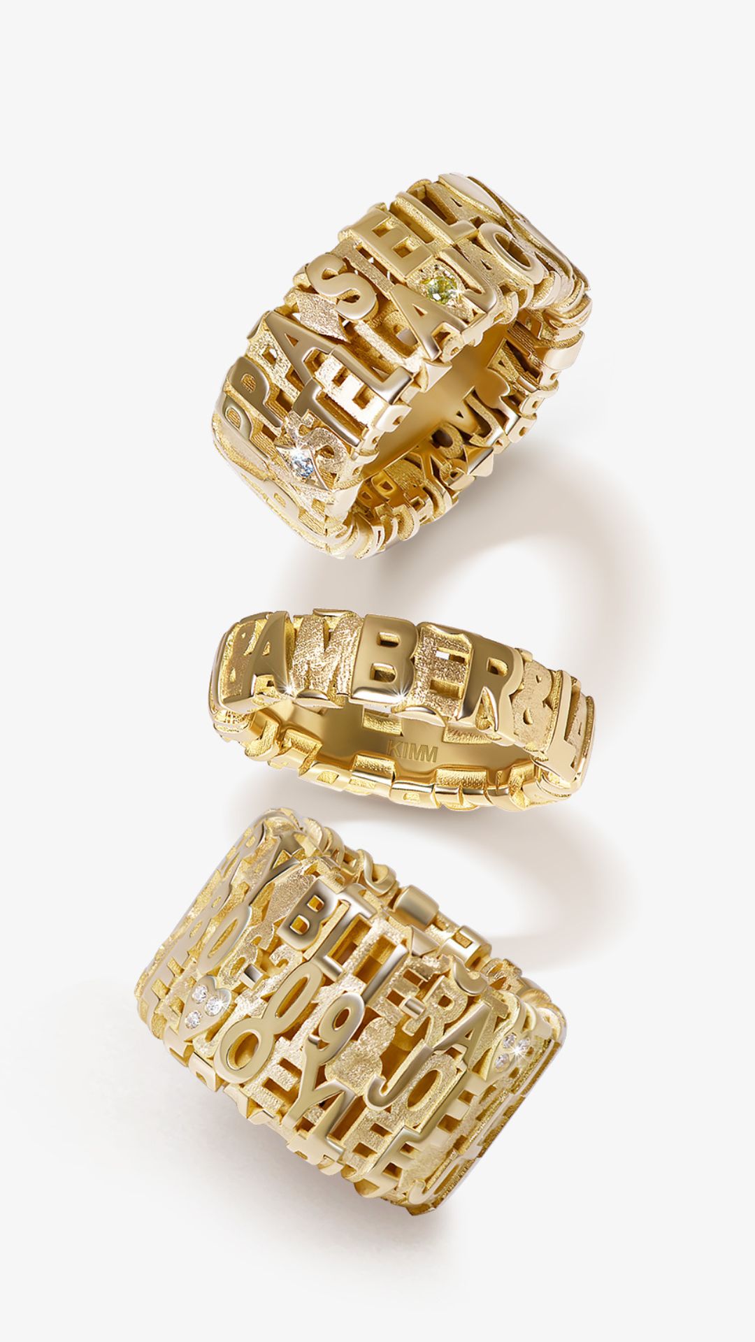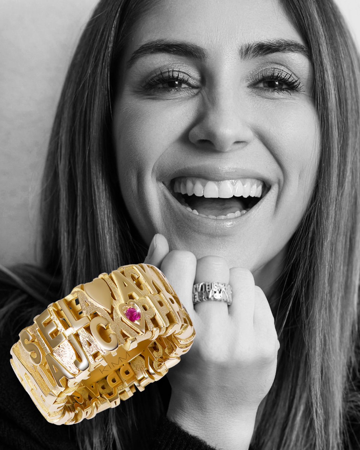 Ook Kim Van Oncen koos zonder twijfel voor de namen van haar kinderen. De namen Jack, Pippa, Stella én hun geboortesteentjes werden in deze geel gouden ring geplaatst. Edelstenen op basis van de geboortemaand om zo de ring extra betekenis te geven. Deze ringen zijn speciaal ontworpen en staan volledig in het teken van de liefde voor hun kinderen.