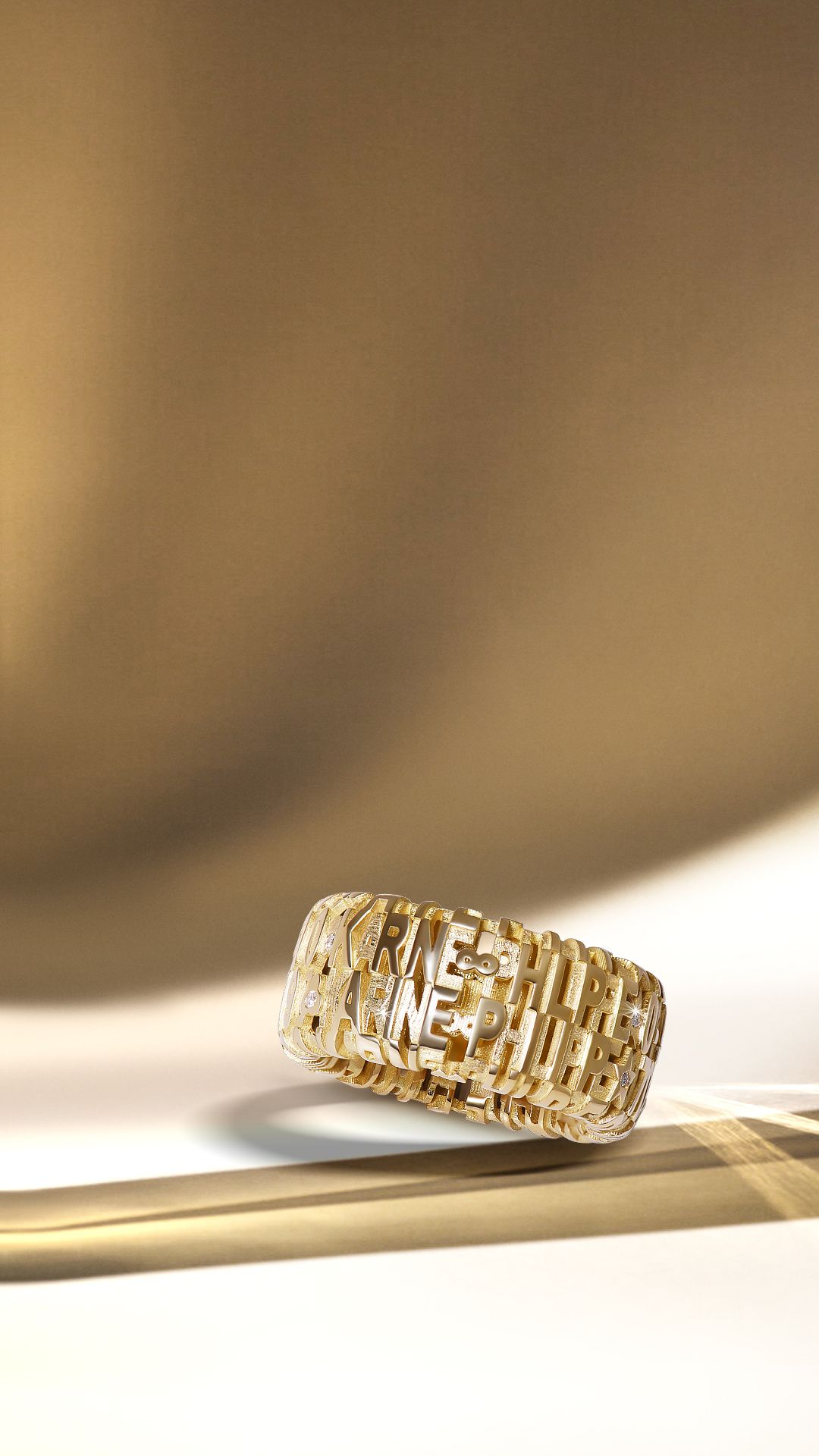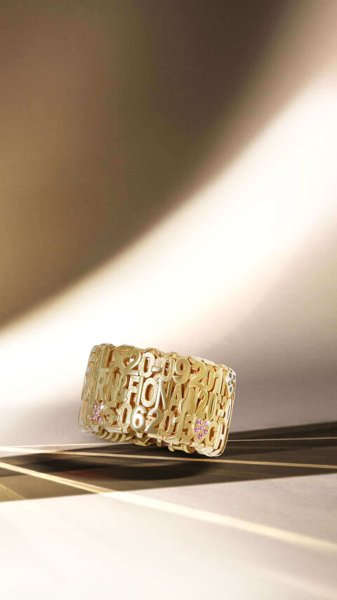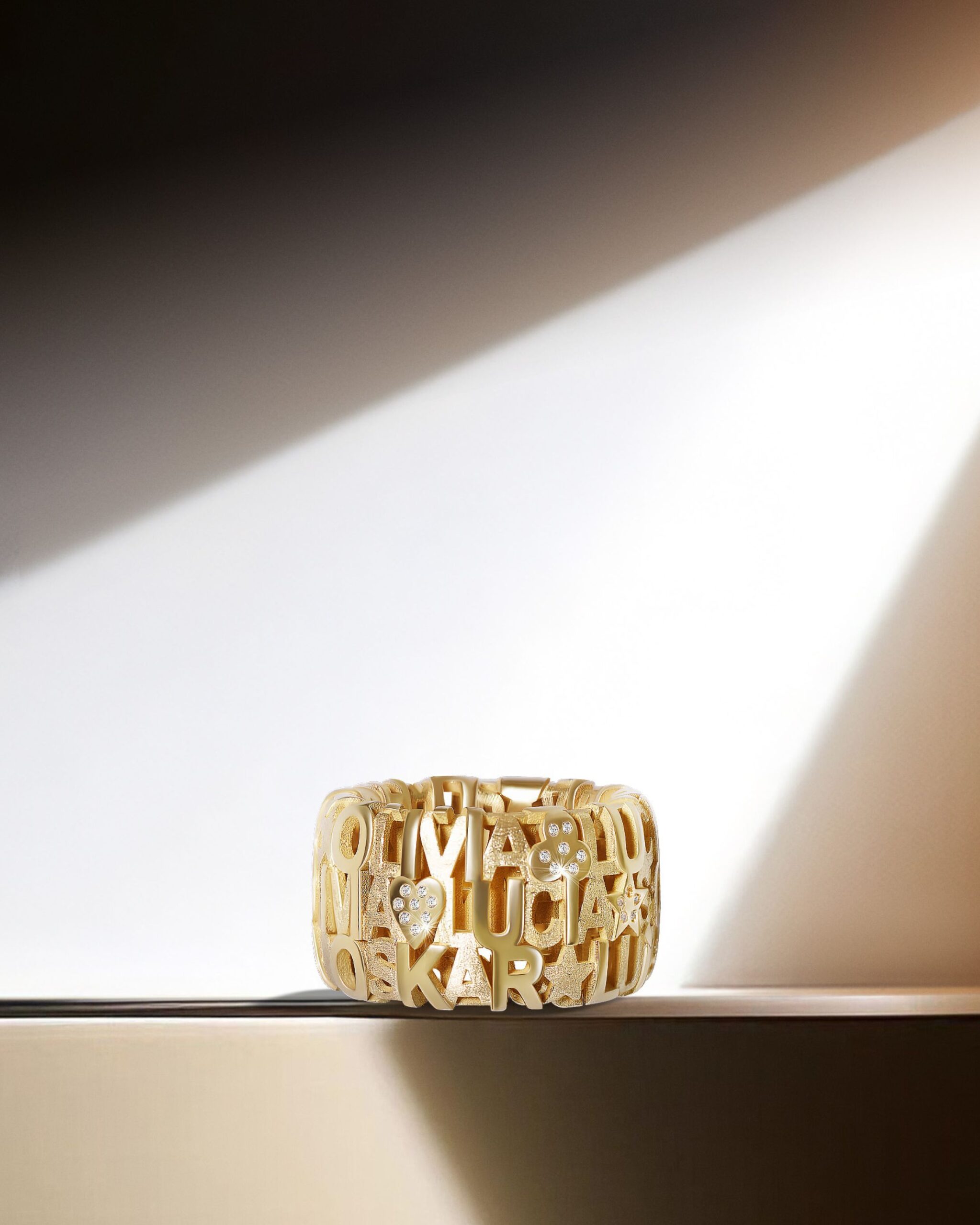 Ook Kim Van Oncen koos zonder twijfel voor de namen van haar kinderen. De namen Jack, Pippa, Stella én hun geboortesteentjes werden in deze geel gouden ring geplaatst. Edelstenen op basis van de geboortemaand om zo de ring extra betekenis te geven. Deze ringen zijn speciaal ontworpen en staan volledig in het teken van de liefde voor hun kinderen.