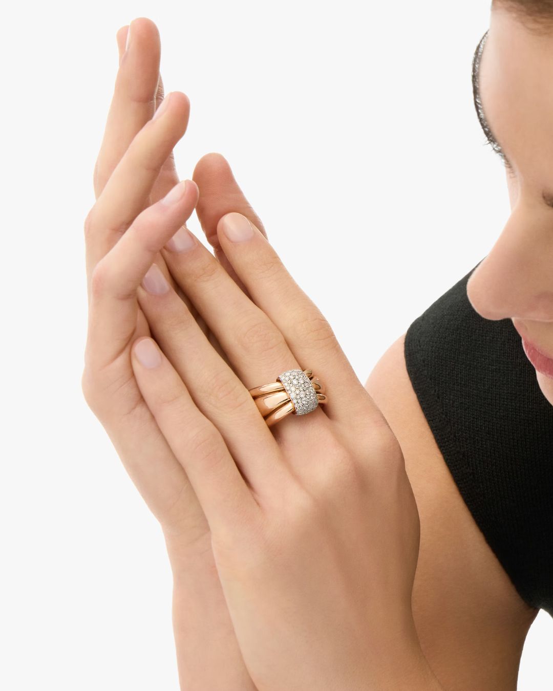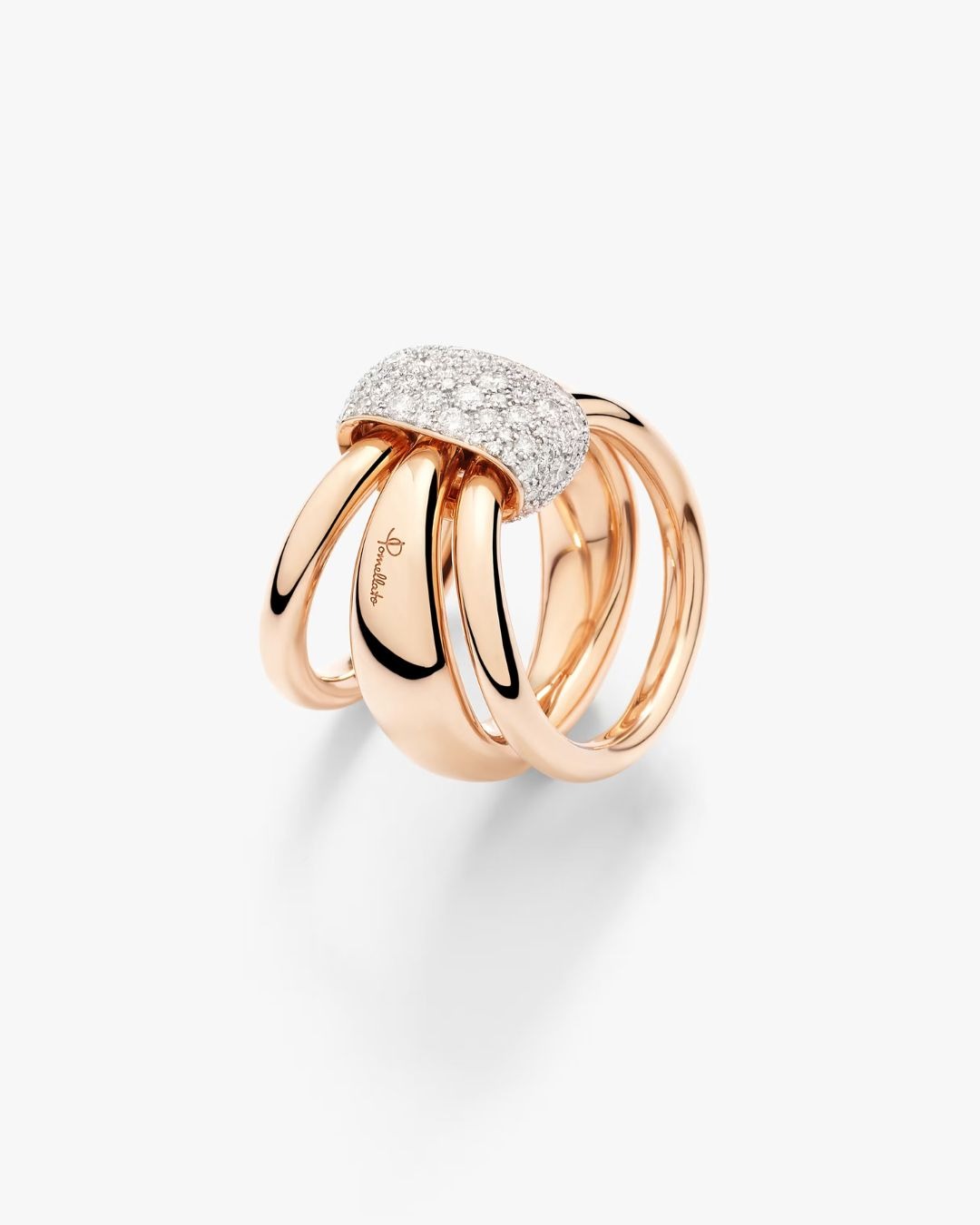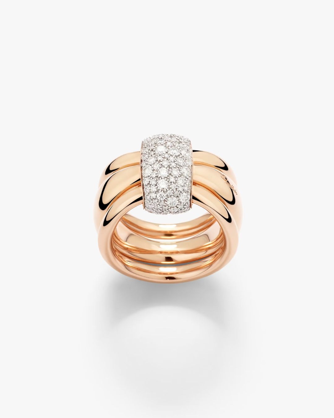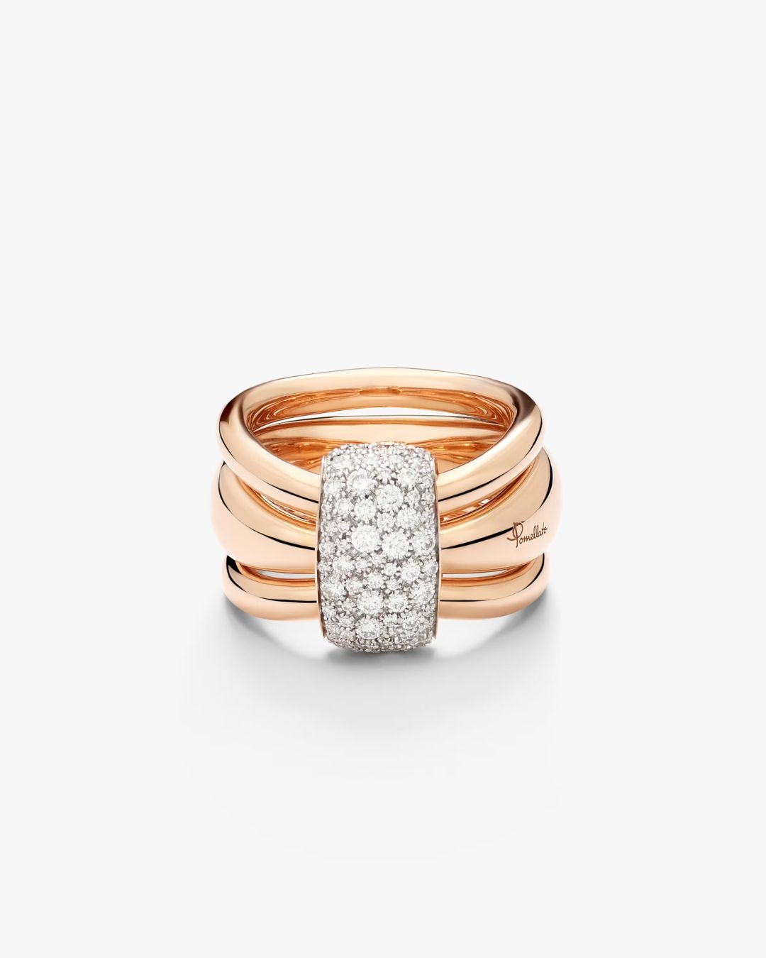 Pomellato Together honors the beauty of bonds — those quiet, powerful connections that shape who we are. Crafted in rose gold, this sculptural ring features three independent bands with a beautifully kinetic feel, united by a fixed central link illuminated with white diamonds on white rhodium-plated rose gold. Pomellato’s signature irregular pavé adds a concentrated gleam, while generous, refined volumes are finished by hand to achieve the Maison’s unmistakable softness and comfort. Worn as a modern pledge or a personal promise, it captures the warmth of togetherness with contemporary poise.